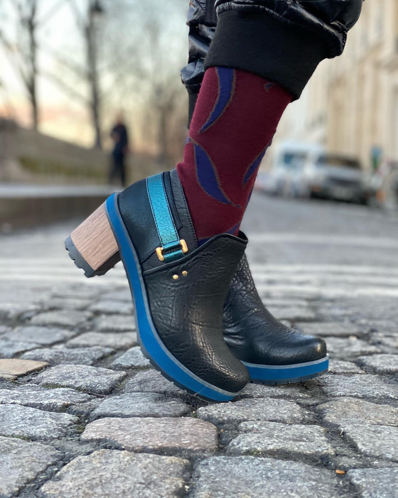 Handgerð úr svörtu leðri með fallegum bláum metallic smáatriðum og gylltum rennilás. KR1808-23 Opt.1 stígvélin sameina fágaðan stíl og leikandi smáatriði sem gefa karakter og lyfta hvaða klæðnaði sem er.