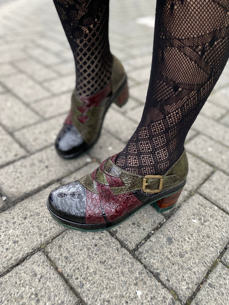 - Handmade with premium patent leather with texture in mix of black, burgundy, brown, and green heel.